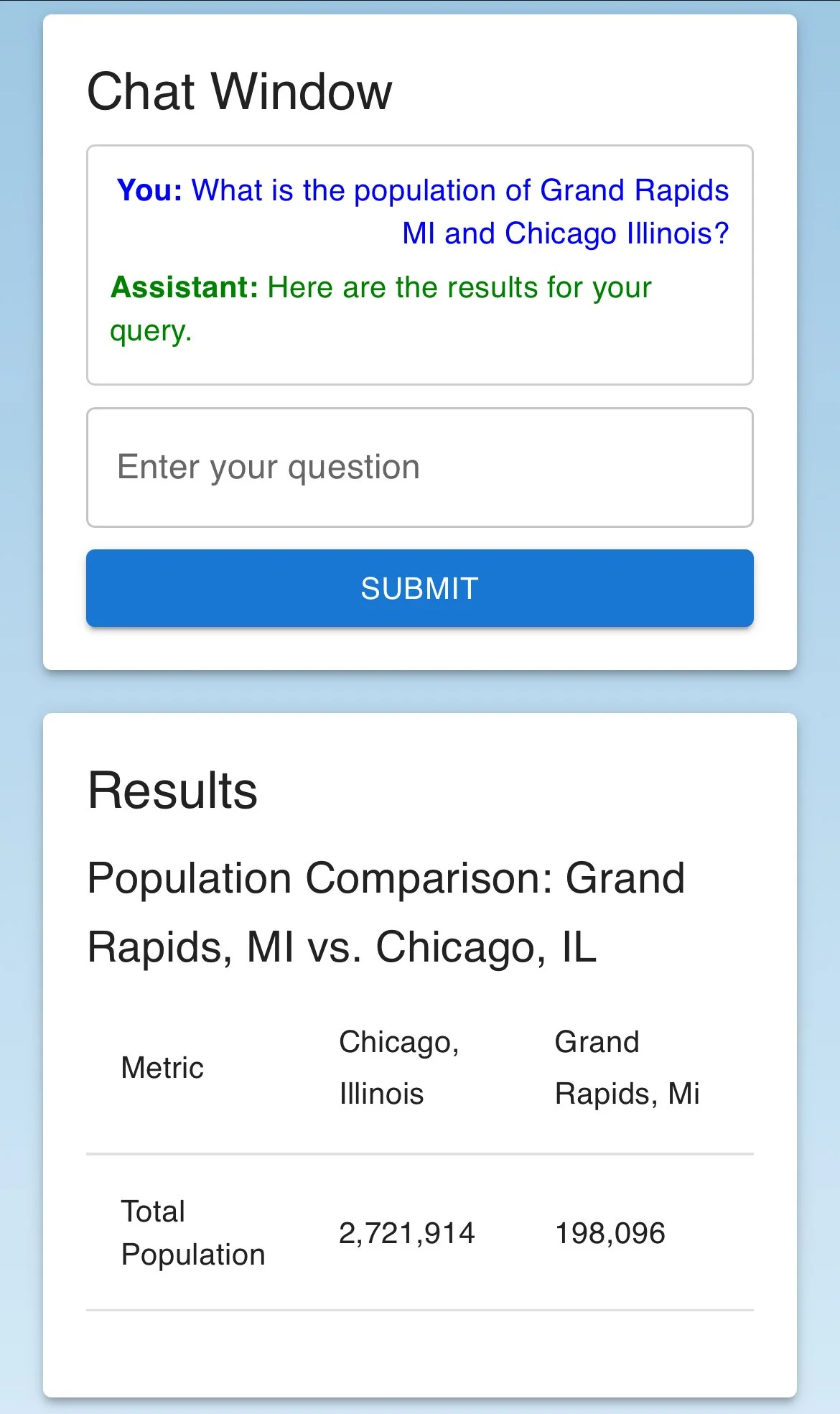 This solution effectively simplifies access to the ACS database, making it more accessible to non-technical users. As a proof of concept, I am satisfied with its performance, but there is room for improvement.